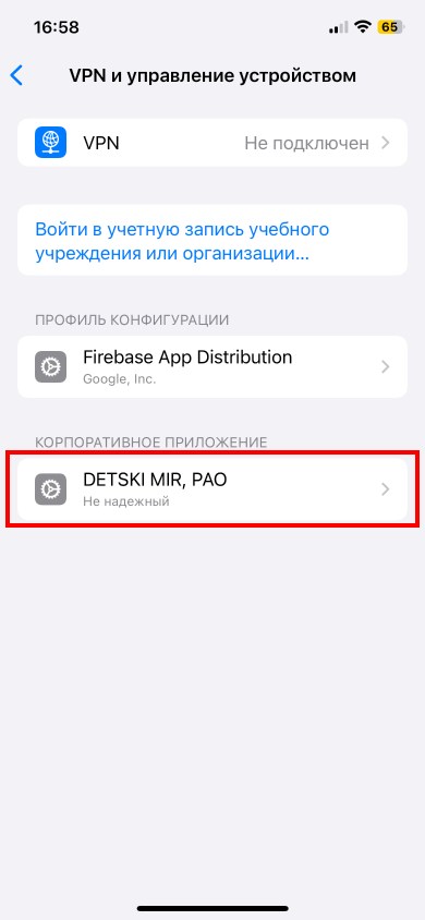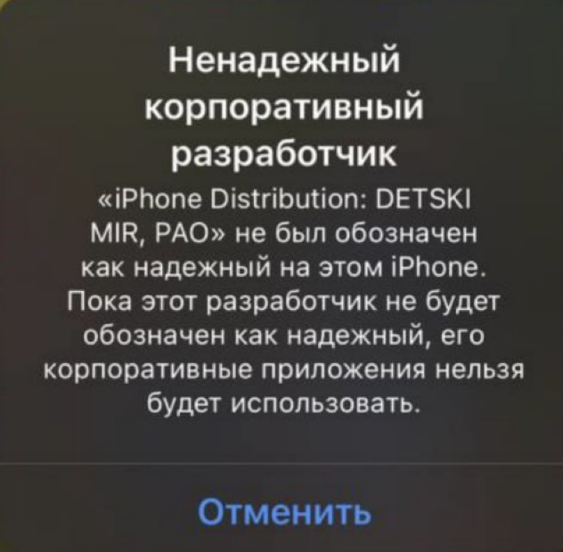 Если возникает ошибка «Ненадежный корпоративный разработчик», нажмите «Отменить»…