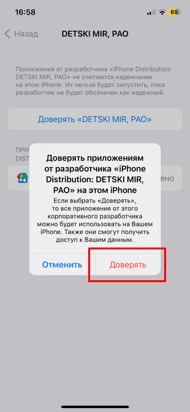 Нажмите «Доверять «DETSKI MIR, PAO»…